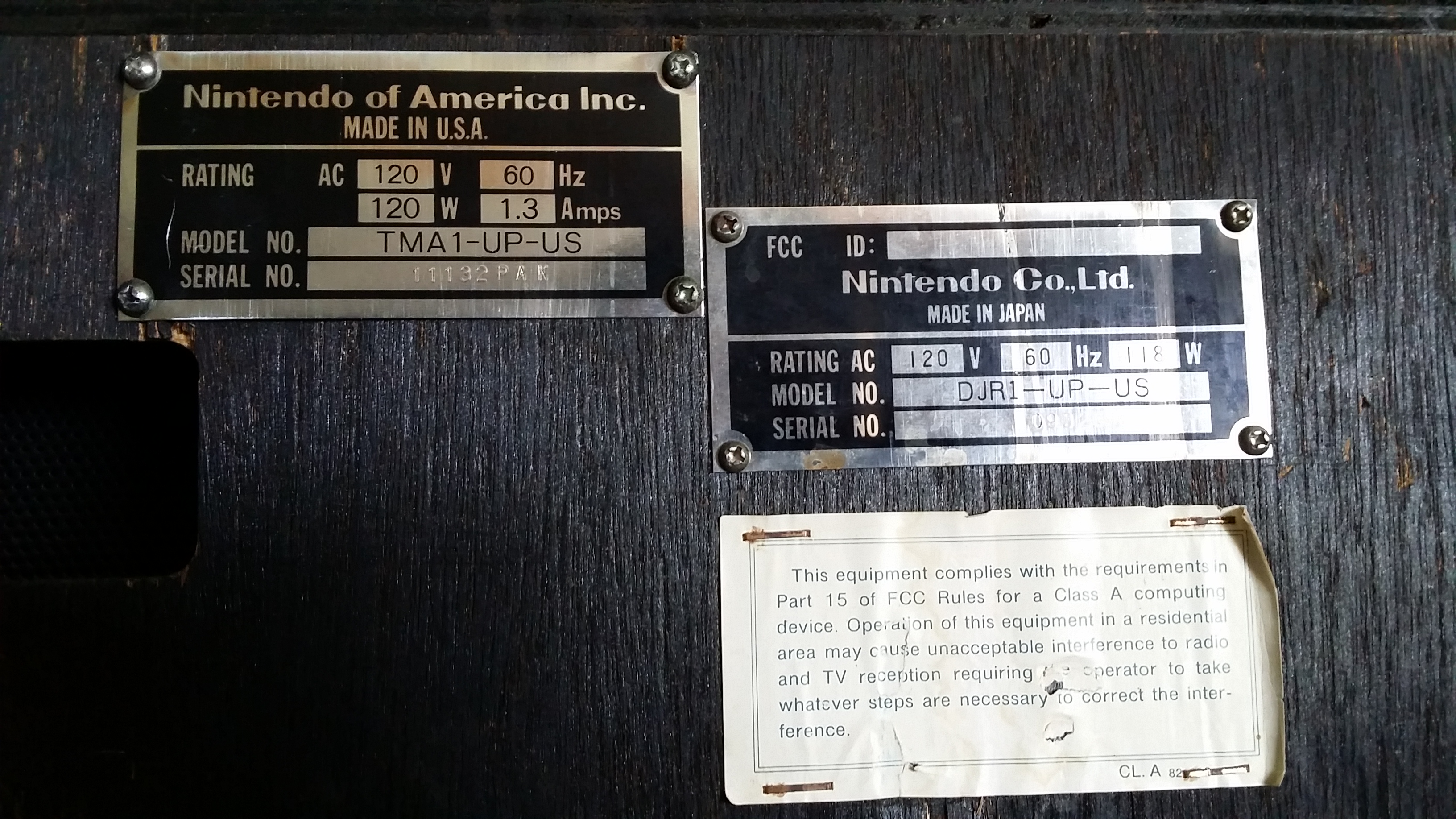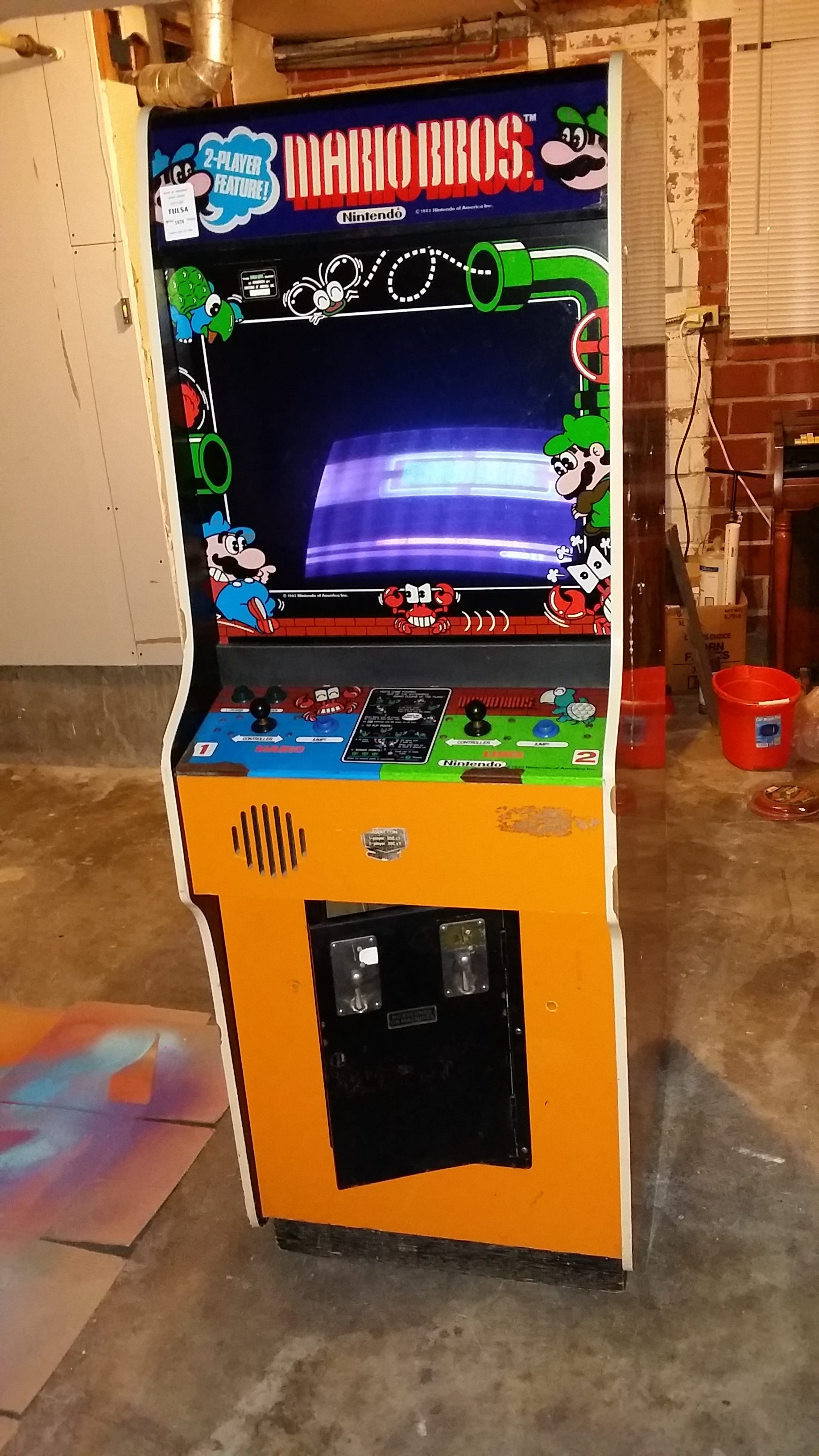This cabinet used to be a Donkey Kong Jr. machine, but at some point in the distant past, it was converted into Mario Bros. This cab is thinner than the dedicated Mario Bros. cabs (which are black in front and generally referred to as "wide body"). When Donkey Kong Jr. stopped making money, an arcade operator could call Nintendo, and a tech would come out with a conversion kit (or "Nintendo-Pak") and perform the conversion. On this cab, they left the original DK Jr. serial number plate and put the Mario Bros. plate to the left.