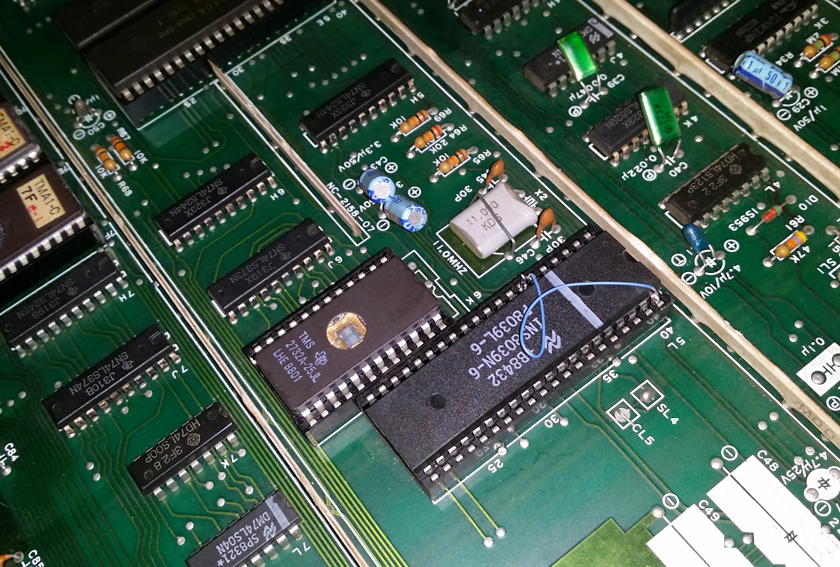 Another problem to fix was that the sound wasn't working properly. The only sounds were those of Mario and Luigi walking, which are actually created by an analog circuit. The rest of the sounds are generated digitally through an M58715 custom chip. These are hard to come by these days but it's possible to replace it with an 8039 MPU, tying pin 7 on that chip high. I got one from Twisty Wrist Arcade. At this point it also becomes necessary to burn a new sound ROM because Nintendo's instructions to the original custom chip are slightly different. I got a 2732 EPROM and burned the patched ROM to it. These chips were socketed on the board which made this part extremely easy.