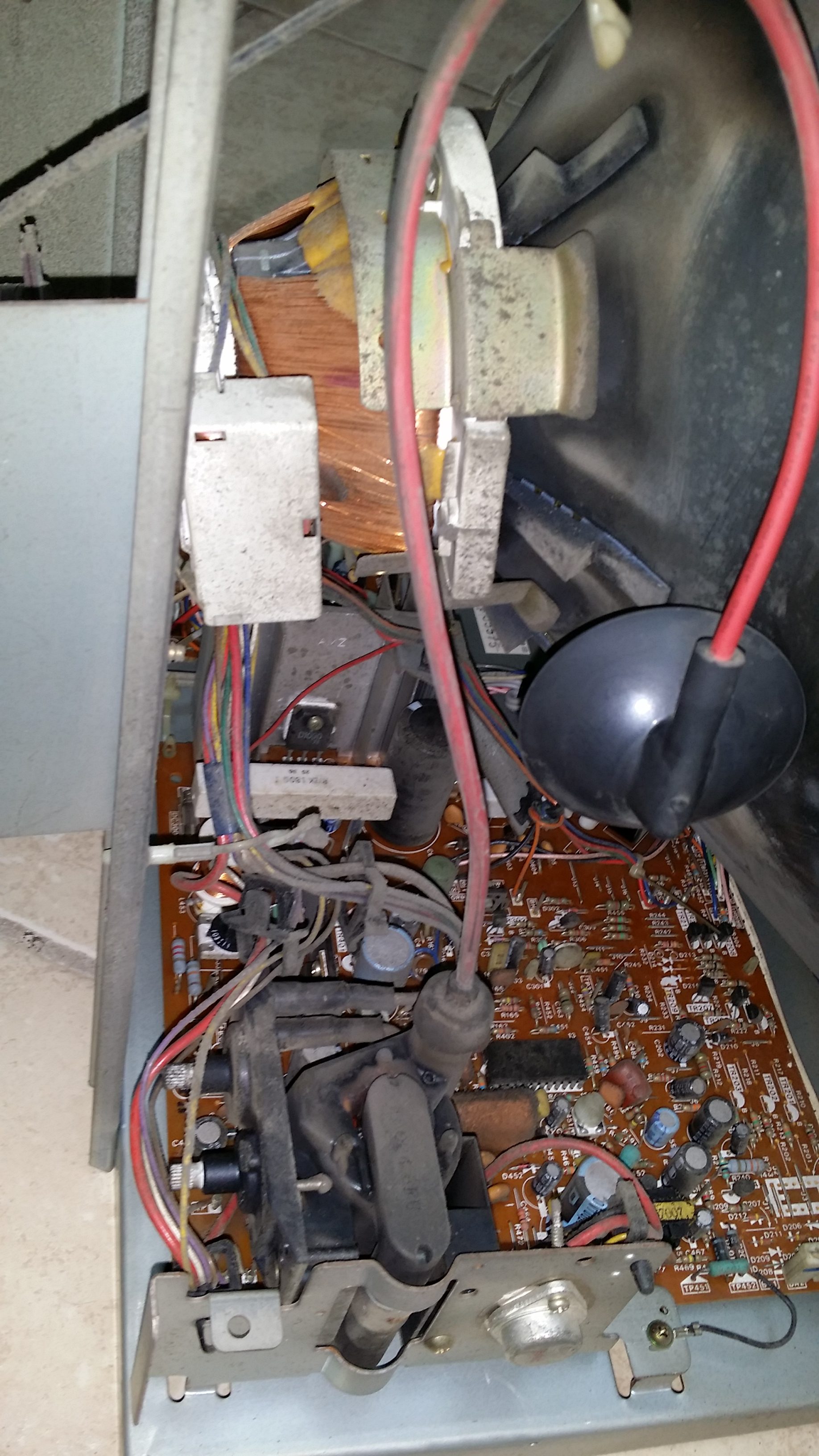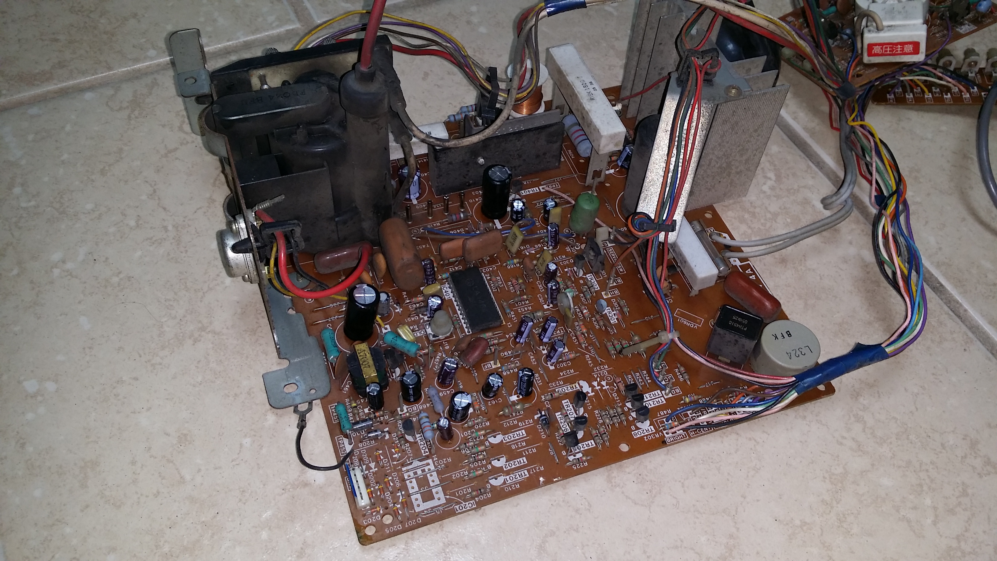 Next thing I got done was the monitor. Removing the front plex I was greeted with an endless sea of dust. Removing the monitor from the cab isn't the easiest task in the world, and some people prefer working on them while still in the cab. There wasn't enough room or light for me to try that, so out it came. I disassembled the monitor and dusted everything off, and began replacing the caps. It took about an hour to get them all replaced once I had everything taken apart.