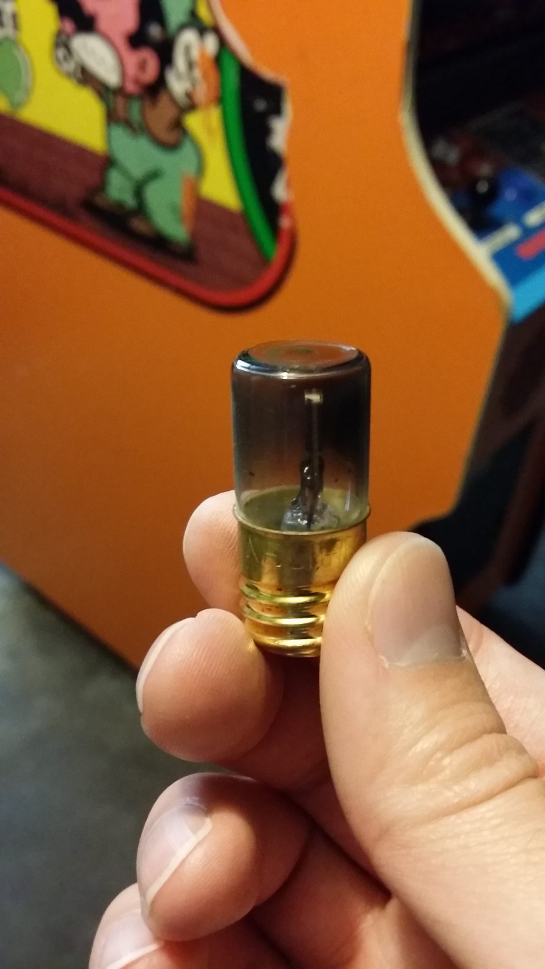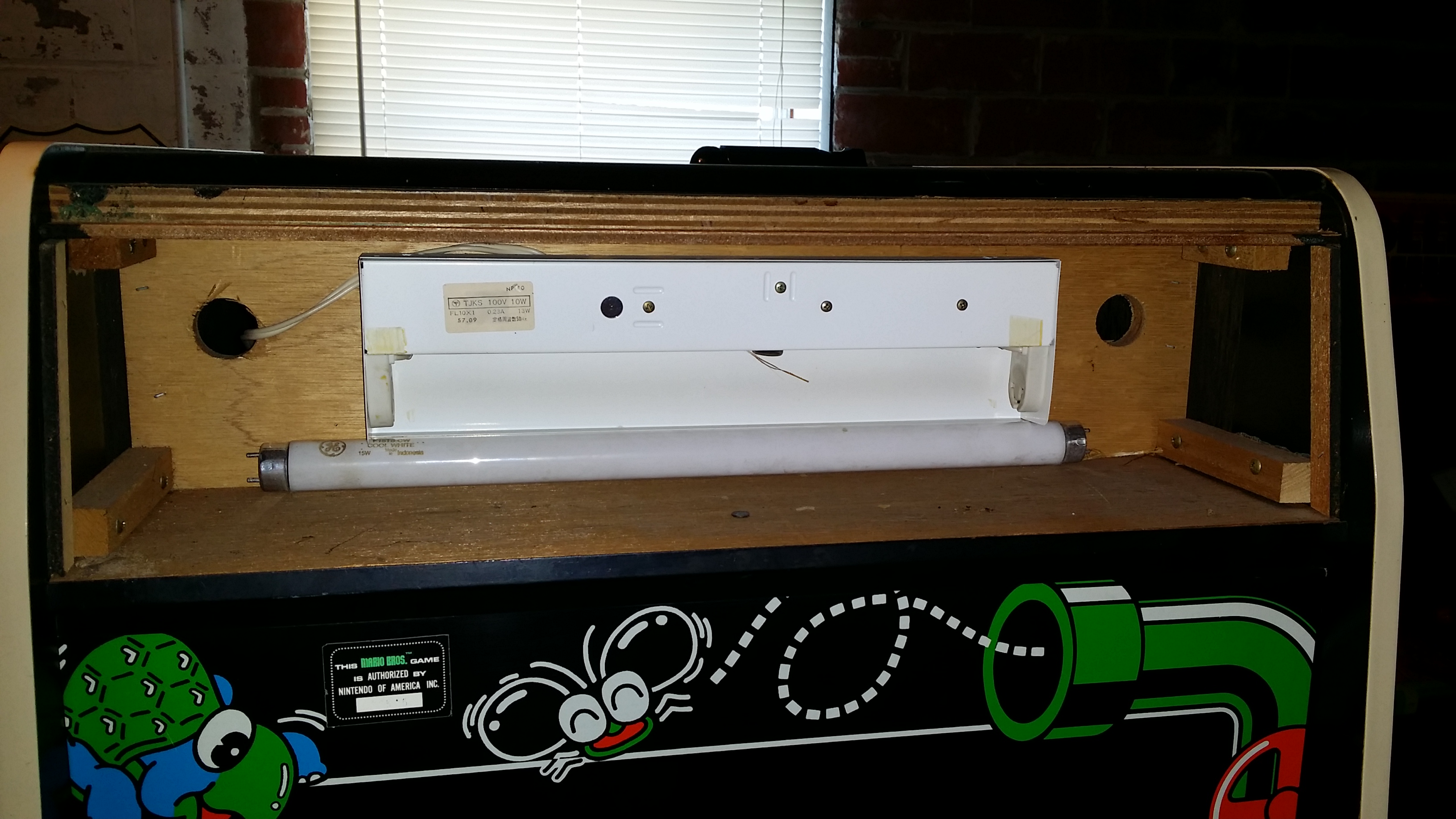 Last was the marquee light. The old light was long gone, replaced by one that was much too long to fit, but was mysteriously left in the cabinet anyway. The starter also looked shot, so I had to find both. The original bulb, a 10-watt FL10D, is designed for the 100-volt Japanese fixture and is somewhat hard to find. Likewise, the starter, an FG-7E, wasn't in stock at my local supplier. However, a standard F10T8 bulb seems to work fine. I ended up using an FG-1E starter which has the same size screw base and is compatible with 10-watt bulbs.