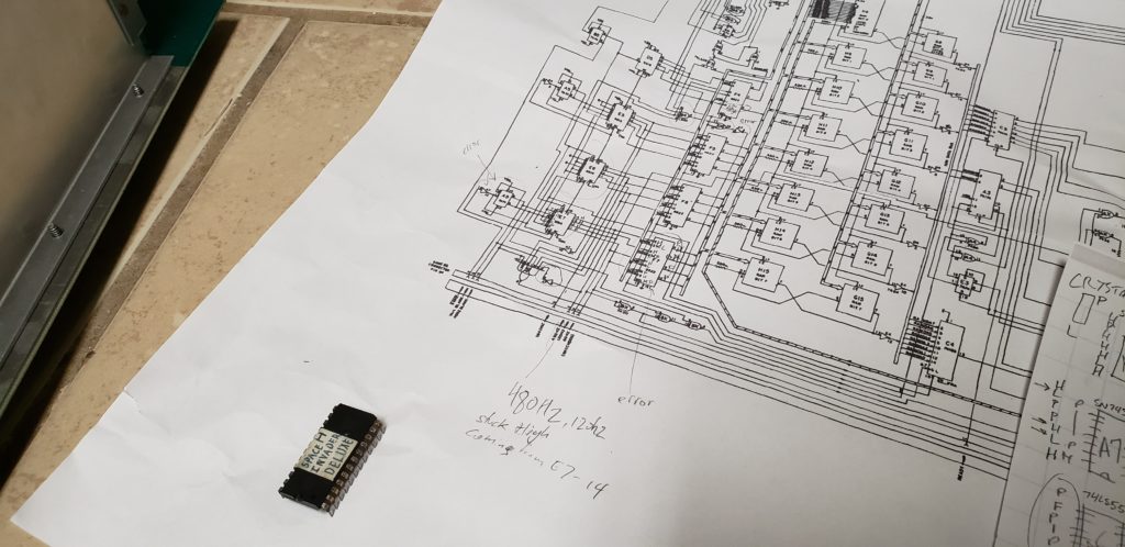 Using my logic probe, I compared the state of each pin to what was on the diagram, which helped me to identify chips that were potential problems. Then after several hours of studying the motherboard schematics, since I am no electrical engineer, I traced the incorrect signals back to two possible chips.