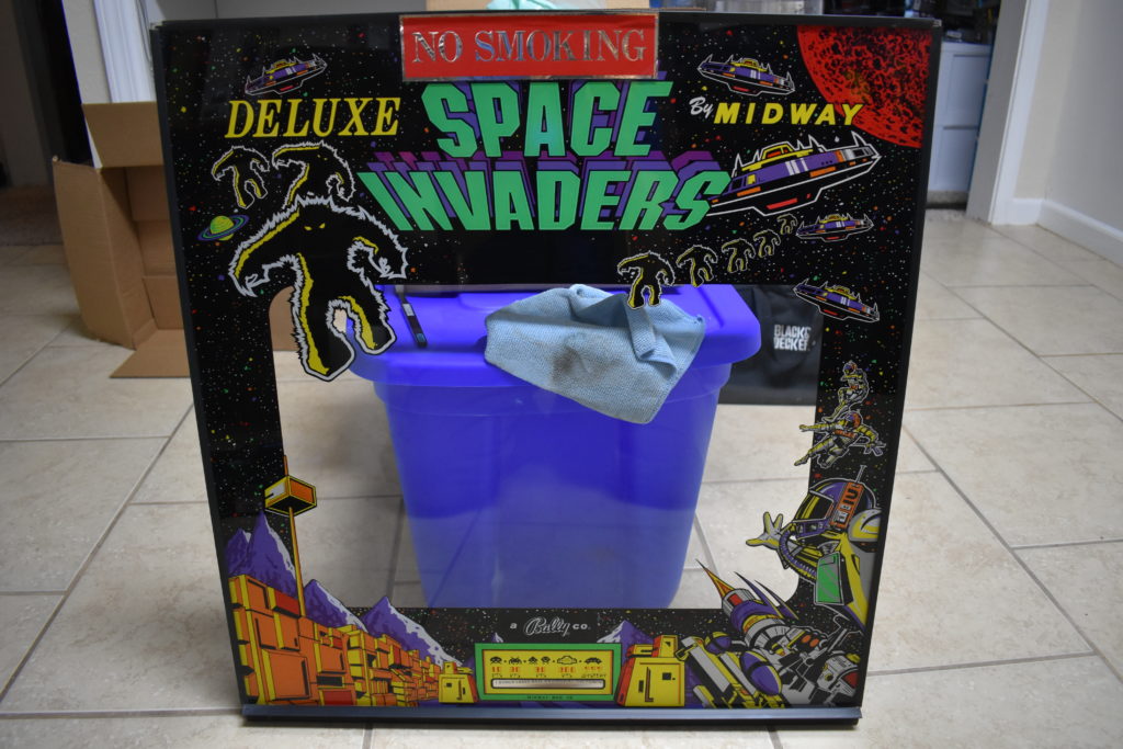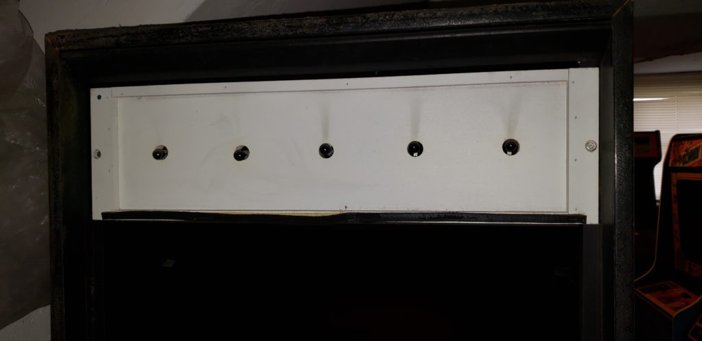 While I pondered setting that up, I did some cleaning of the cabinet's display area, which was full of dead spiders and dust from being forgotten in a building for who knows how long. The marquee area had a big "NO SMOKING" sticker on it, obviously necessary because of how horribly marred and burnt by ash the control panel had become.