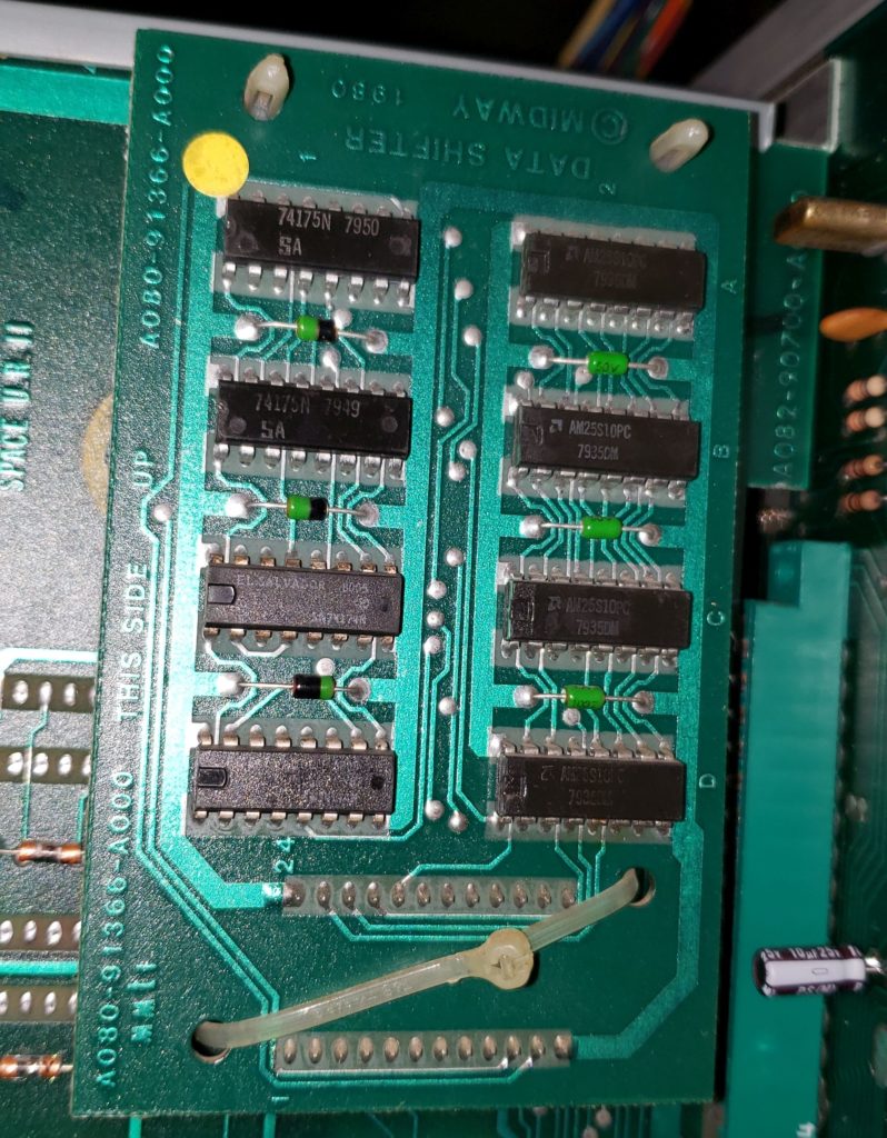 The bit shifter is an ancillary piece of hardware that is responsible for the movement of the invaders on the screen because the CPU is too slow to handle moving them while keeping track of the rest of the game. If the shifter is malfunctioning, it can cause errors like this. It can also apparently cause the game to end prematurely when all the aliens decide to rush you at once after you've been playing for a few seconds. I got lucky because the 74175 chips are fairly easy to find, but the AMD 2510s (which are controlled by the 74175s) on the right side of the board are not so common. I replaced both 74175s because there's not a really good way to tell which one is bad while they're in circuit.
