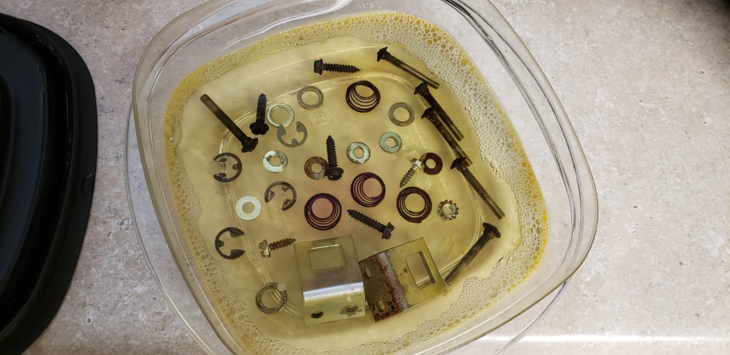 I removed the hardware from the control panel and went out to give it a good scrubbing before dunking everything in Evaporust for a night. I really want to get new #8 carriage bolts for this but no one locally keeps them in stock, so I haven't gotten around to ordering them yet.