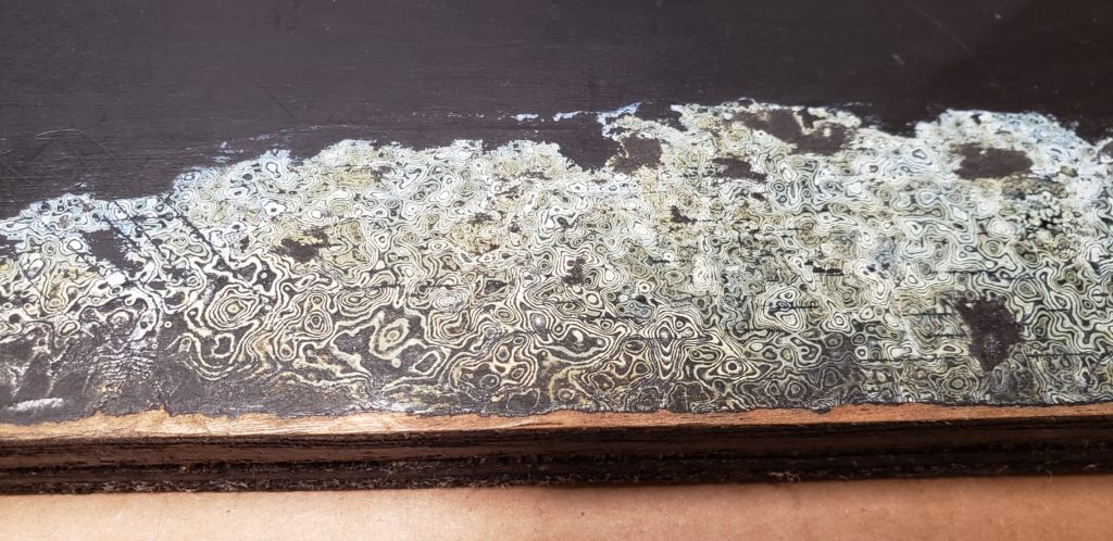 After quite a lot of scraping and pulling, I removed all of the old adhesive. Underneath there were some really trippy patterns that I assume were caused by something spilling underneath the parts where the old overlay had broken off.