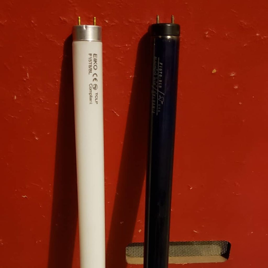Now, while I was figuring this out, I still had some cabinet maintenance to do. At some point in the distant past, the original white blacklight in the cabinet was replaced with a regular purple blacklight. This massively dims the illumination behind the playfield, rendering the moon base diorama almost invisible.