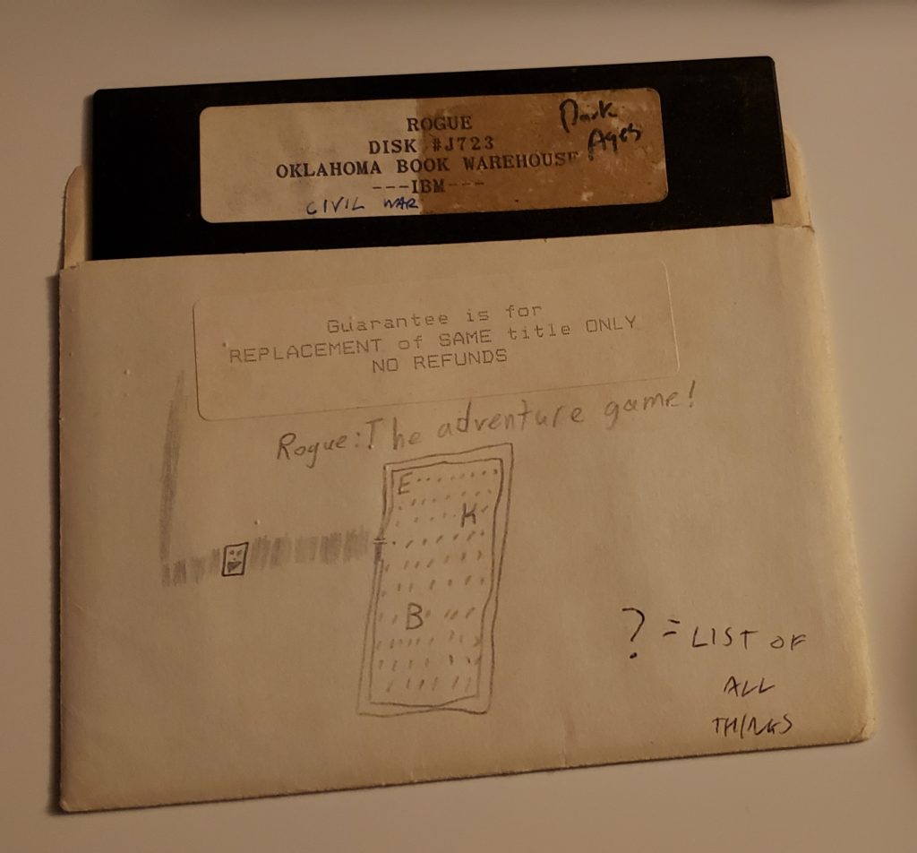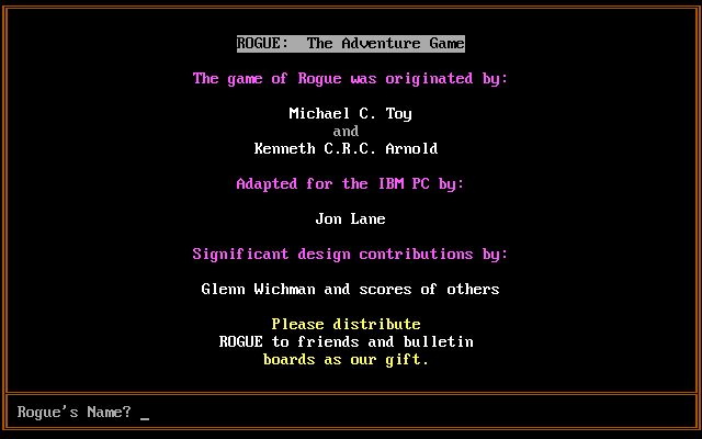 My copy, however, has a notice encouraging you to spread the program to friends and BBS services. Due to this, as a child I had assumed Rogue was basically free software and the disk it arrived on was the only thing you could be charged for.