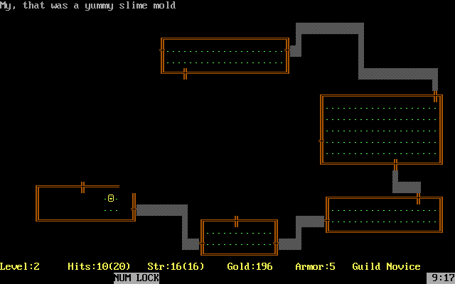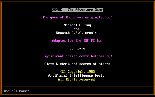 So what's going on here? The widely available versions of Rogue for DOS online today mostly seem to be cracked versions of the original ports by Jon Lane, and from what I can tell they may have been compiled with different options set, some with mangoes and some with slime molds. Bizarrely, the version I had as a child doesn't even seem to have been preserved online so far. Disk #J723 from the Oklahoma Book Warehouse reports itself as a copy of Rogue version 1.1, SN:1349, which is listed on the roguelike archive, but the version there has significant differences from the one I have. The most original-looking copies of v1.1, SN:1349 that I can find were located in the Total DOS Collection, have a date of 1983, and feature a copyright screen for Artificial Intelligence Design.