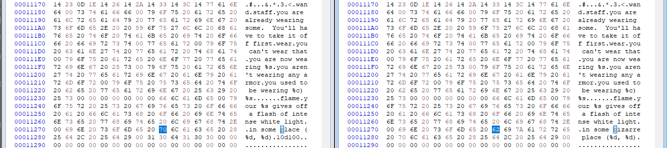 There are of course many other differences between this particular build of the game and other builds aside from whether the fruit is called a mango or not, but that's beyond the current scope of this post. My next goal is to play enough of each copy of v1.1, SN:1349 to find out if they all give out mangoes. (They all have both "mango" and "slime mold" in the code in the same places.) Surprisingly, depending on the dungeon that is generated, it can be incredibly hard to get your hands on a mango.