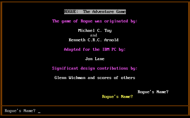 The next one, the version on the roguelike archive, has no text in the copyright area and so gets a glitched copy of the name prompt instead.